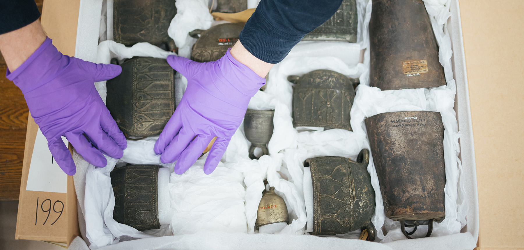 The nine collections move assistants began in early 2020 by auditing and moving 7,000 musical instruments from the Pitt Rivers Museum collection. They moved onto repacking 88,000 stone tools where they lined each box with padded Jiffy to ensure the objects would be safe when moved. Then they weighed, labelled and organised each box onto shelves by country of origin. Before lockdown the team repacked 200 boxes of stone tools, but they then had to pause the project.